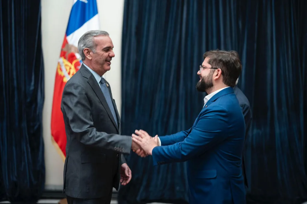 Santiago de Chile.– El presidente de la República Dominicana, Luis Abinader, sostuvo un saludo protocolar con su homólogo de Chile, Gabriel Boric, durante un encuentro celebrado en el Palacio de La Moneda.