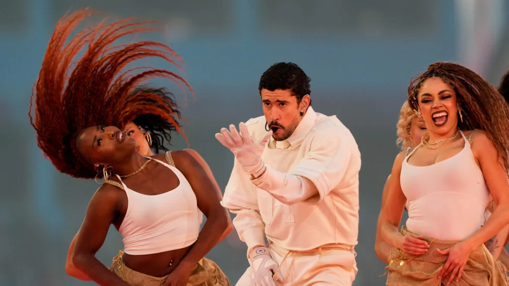 Desde un sembradío montado en pleno césped, Bad Bunny interpretó éxitos como “Tití me preguntó”, acompañado de una coreografía vibrante y una producción visual de alto impacto.