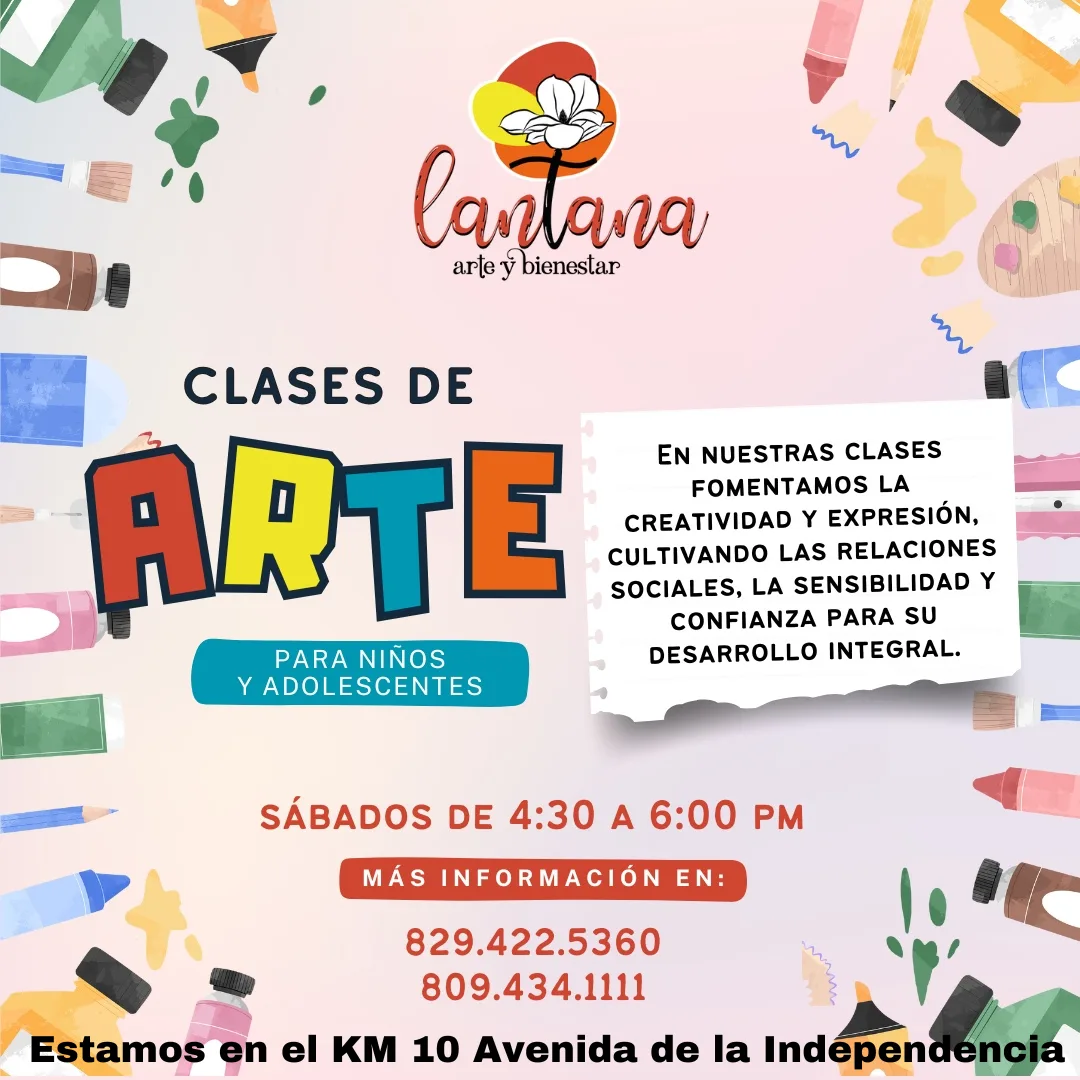 “Lantana: Arte y Bienestar”, ofrece clases de Artes divertidas y ágiles, para niños y adolescentes . Horario: Sábados de 4 a 5.30 pm. También ofrece clases en otros horarios e imparten clases en fundaciones, instituciones y Centros educativos que lo precisen.