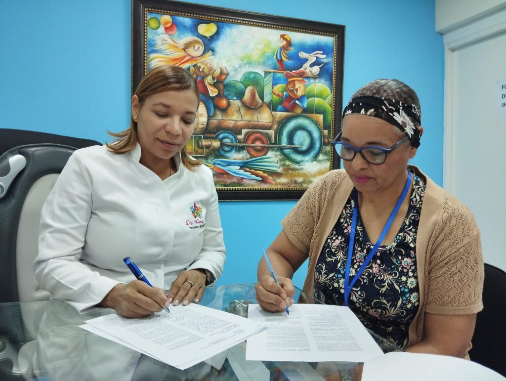 El acuerdo fue rubricado por la directora del hospital pediátrico Arturo Grullón, Dra. Mirna López y la directora del plantel educativo, Licda. Felicia Hernández González, MA, para que dichos jóvenes/estudiantes tengan la oportunidad de iniciar las pasantías/prácticas en el hospital pediátrico.