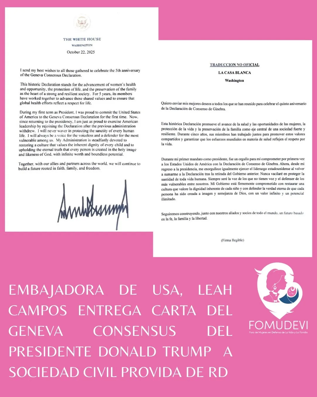 Durante la reunión, la diplomática compartió con los asistentes una copia de la carta de la Declaración de Consenso de Ginebra, emitida por el expresidente Donald Trump, como parte del intercambio de información sobre políticas internacionales relacionadas con la mujer, la familia y la protección de la vida.