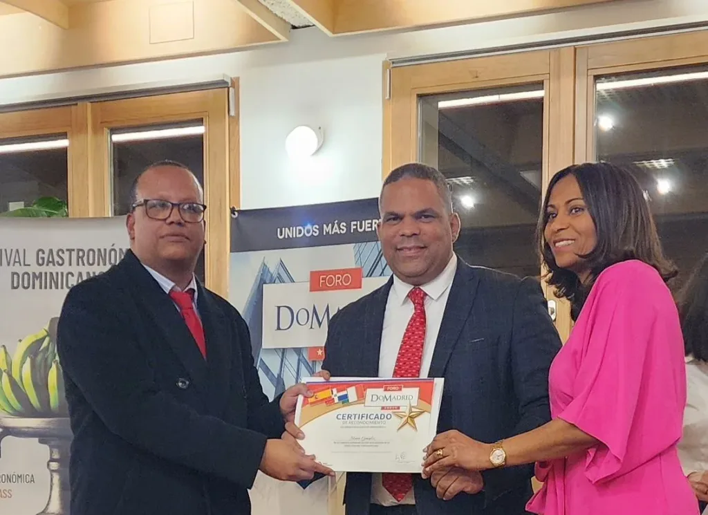El pergamino de reconocimiento fue entregado por Frank Segura, presidente del Foro DoMadrid y de RD Exquisita, junto a Maribel Santos Pérez, directora de la entidad.