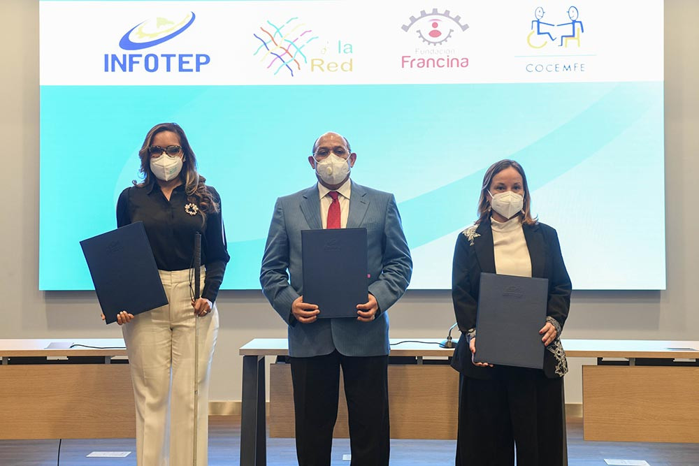 Fue suscrito por Rafael Santos Badía, director general del INFOTEP, Francina Hungría, presidenta de la Fundación que lleva el mismo nombre, y Soraya Santos, representante legal de la Red Iberoamericana de Entidades de Personas con Discapacidad.