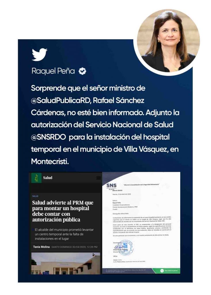 En un tuit subido esta tarde en su cuenta @raquelpeñavice, la compañera de boleta de Abinader escribió: “Sorprende que el señor ministro de @SaludPublicaRD, Rafael Sánchez Cárdenas, no esté bien informado. Adjunto la autorización del Servicio Nacional de Salud @SNSRDO para la instalación del hospital temporal en el municipio de Villa Vásquez, en Montecristi”.